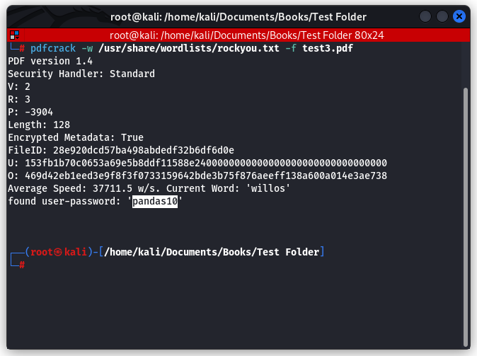 The program was able to crack the PDF because the target’s password was in the wordlist. The success of this attack depends on the accuracy of the wordlist. This is why you are encouraged not to use common or guessable passwords.