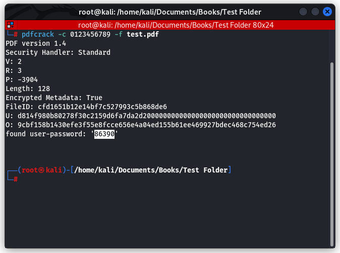In this scenario, we assume that we have seen the user enter their password before. We don’t really know what it is, but we know it’s all digits. So, while in the directory where the target PDF (test.pdf) is, we type in the command: