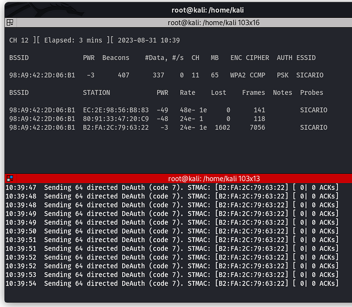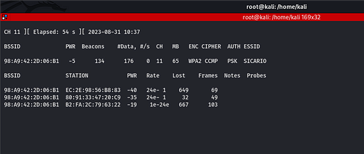 From the second row, we have the STATION parameter. This represents the MAC address of the users connected to the wireless (Wi-Fi) network. Notice how they all have the same BSSID? It means they’re all connected to the same Wi-Fi network. In this case, connected to the same network as me. By the way, MAC address, short for Media Access Control address, is a unique identifier assigned to network devices, like network interface cards (NICs) and wireless adapters, to identify them on a network. This parameter is important in deauthenticating the user.