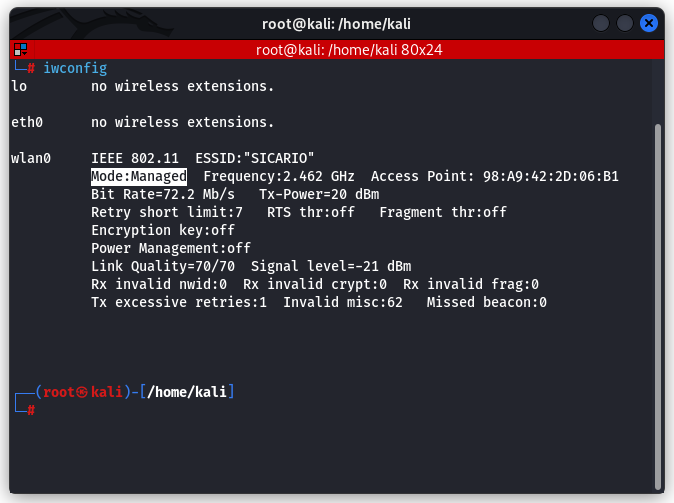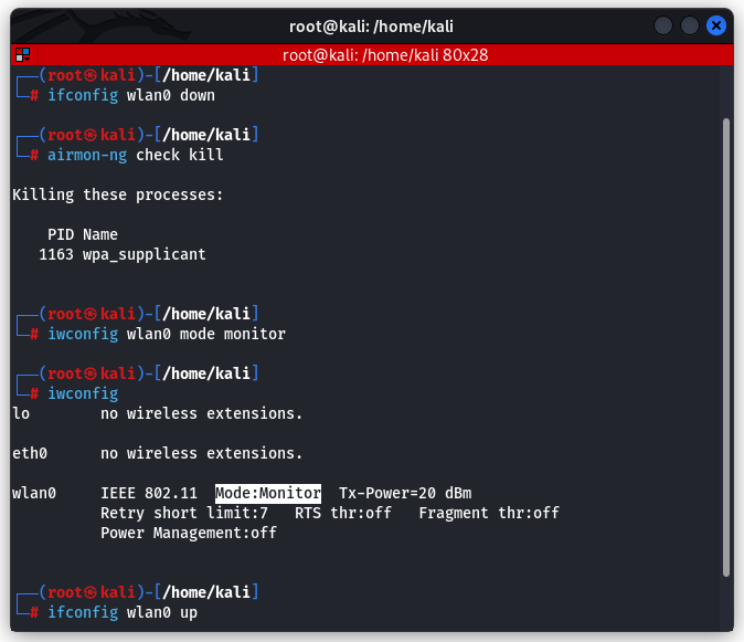 This command disables or turns off the wireless network interface wlan0 (our wireless adapter). It effectively disconnects the wireless interface from any active network connections. We need this off because we are about to switch to a different mode (monitor) and we can’t have it running while doing that.