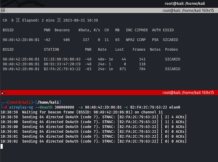 --deauth 3000000000: Sends deauthentication frames continuously (3 hundred million times in this case) to disrupt devices on the network. Feel free to experiment with other numbers of frames. While testing I noticed that extremely large numbers didn’t really get the job done. For testing, 300 million is fine. Feel free to experiment with other values. Also, remember that this parameter would determine how long the user would get deauthenticated for.