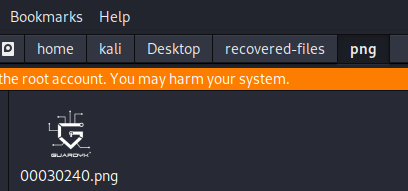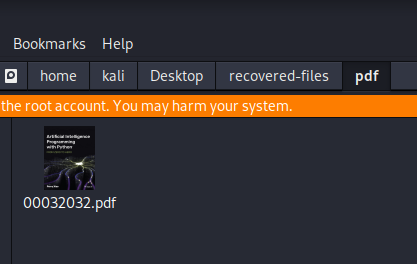 Recovered PDF and PNG files. Ignore the message in orange. Kali is just telling you to be careful when you access files as root.